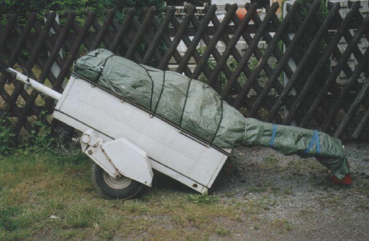 Bei Abstellen im Freien wie abgebildet verfahren, da bei anderer Abstellung Wasser über die Zeltstangen in den Hänger läuft.